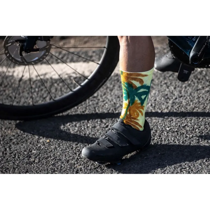 De Hawaii sokken zijn onderdeel van de Rogelli Hawaii set en passen perfect bij het Rogelli Hawaii fietsshirt. De Hawaii sokken zijn bedrukt met behulp van een innovatieve printtechniek, waardoor de print mooi uitkomt en jij gesoigneerd de weg op kan. De wielersokken zijn gemaakt van een elastische Lycra stof en hebben een anatomische pasvorm. De versterkte band rond de wreef biedt extra ondersteuning. Deze versterkende weeftechniek is ook toegepast op de hiel en de tenen. De naadloze tenen voorkomen irritatie.